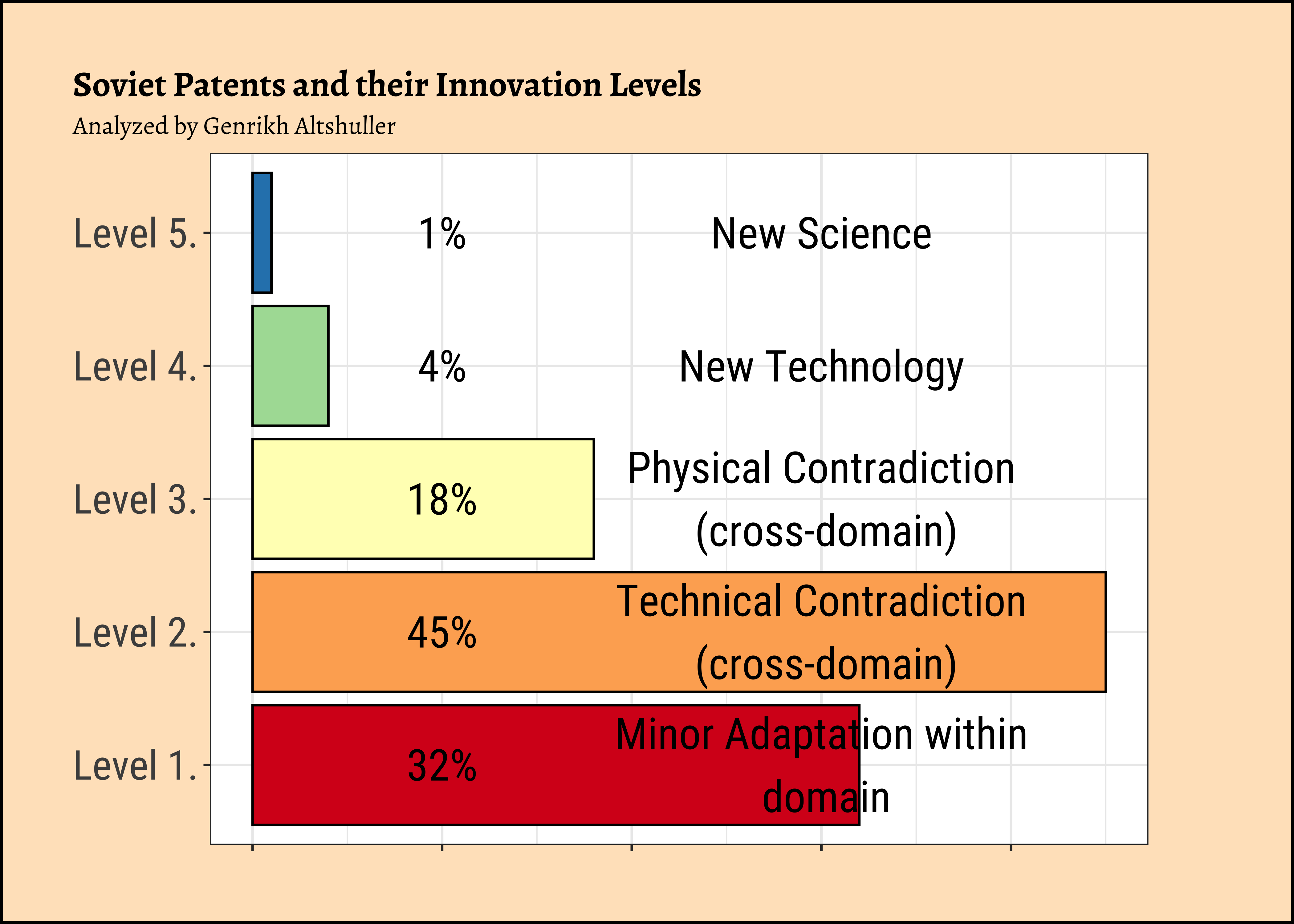 Altshuller concluded from his research that a large number of patents (77%) belong only to Levels #1 and #2. The practical utilization of TRIZ methodology can help inventors elevate their innovative solutions to Levels #3 and #4. As a result of this work, hundreds of technical papers and many books on TRIZ have been published, including 14 books by Altshuller himself.