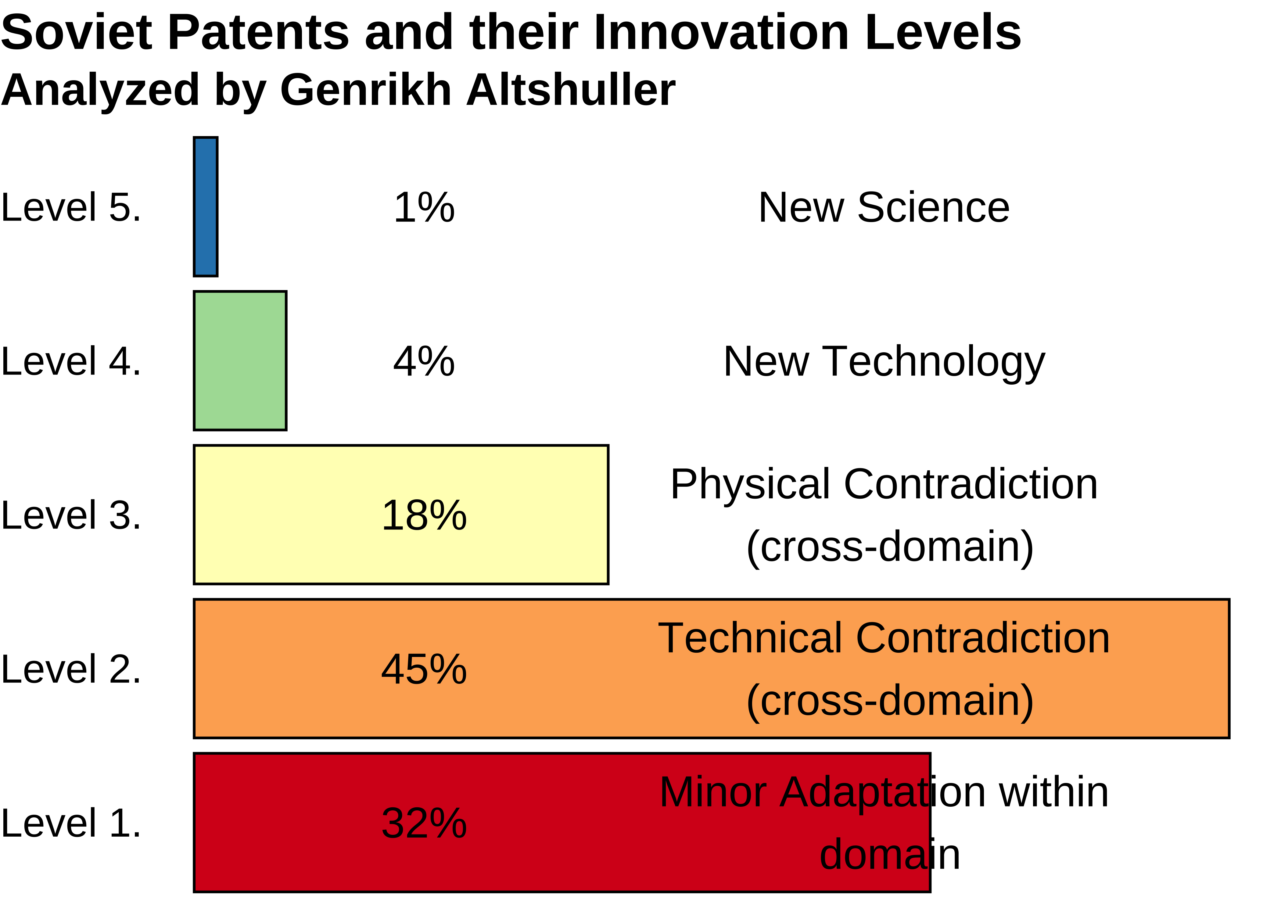 Altshuller concluded from his research that a large number of patents (77%) belong only to Levels #1 and #2. The practical utilization of TRIZ methodology can help inventors elevate their innovative solutions to Levels #3 and #4. As a result of this work, hundreds of technical papers and many books on TRIZ have been published, including 14 books by Altshuller himself.