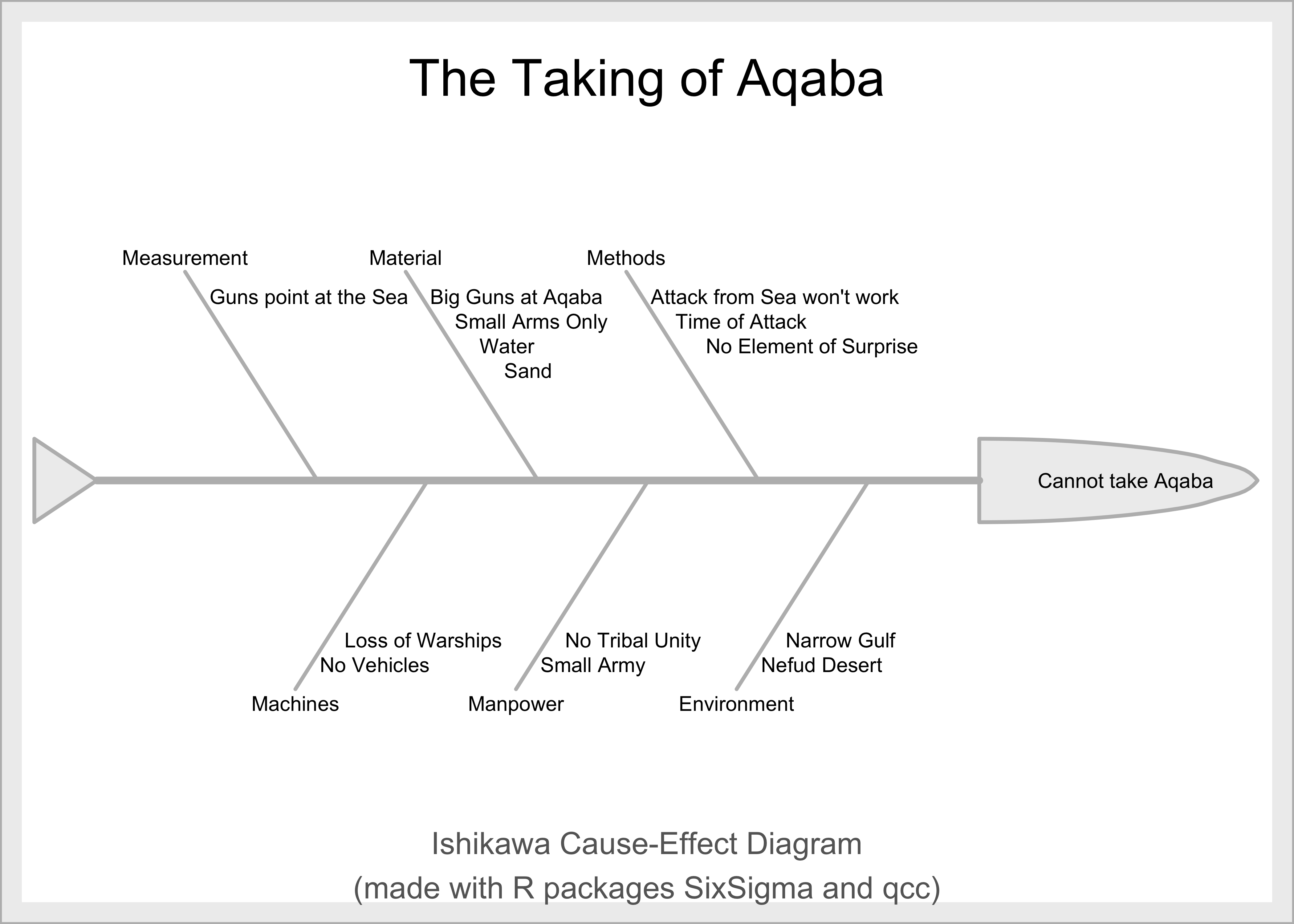 Turning the knobs/parameters in the Ishikawa Diagram, it seems that if the British allies attack Aqaba, they may win, BUT they may lose a few warships. If the Arabs want to attack, they are too small in number and have no warships, and hence their chances of success are very slim. Herein lies the Contradiction, which we can now specify as an Administrative Contradiction(AC) in plain English:
